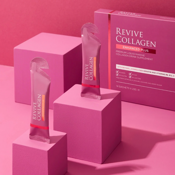 Revive Collagen Enhanced Plus 14 Days contains 10,000 MG of Type 1 hydrolysed Marine Collagen per serving, along with an expert blend of nutrients and vitamins to support a healthy skin and body. Hydrolysed Keratin helps hydrate, strengthen, and nourish hair, while Retinol helps to promote skin renewal and enhance the production of collagen for a brighter, more youthful looking complexion. Key Vitamins B6 & B12 have been proven to reduce tiredness and fatigue, while contributing to the normal function of the nervous system and normal red blood cell formation. Antioxidant rich Vitamin C & D visibly brighten the skin tone and reduce signs of ageing including fine lines and wrinkles, while helping to increase iron absorption for a visibly radiant, healthy glow. With a new and improved flavour, this easy to take collagen drink features a natural, delicious tropical taste.